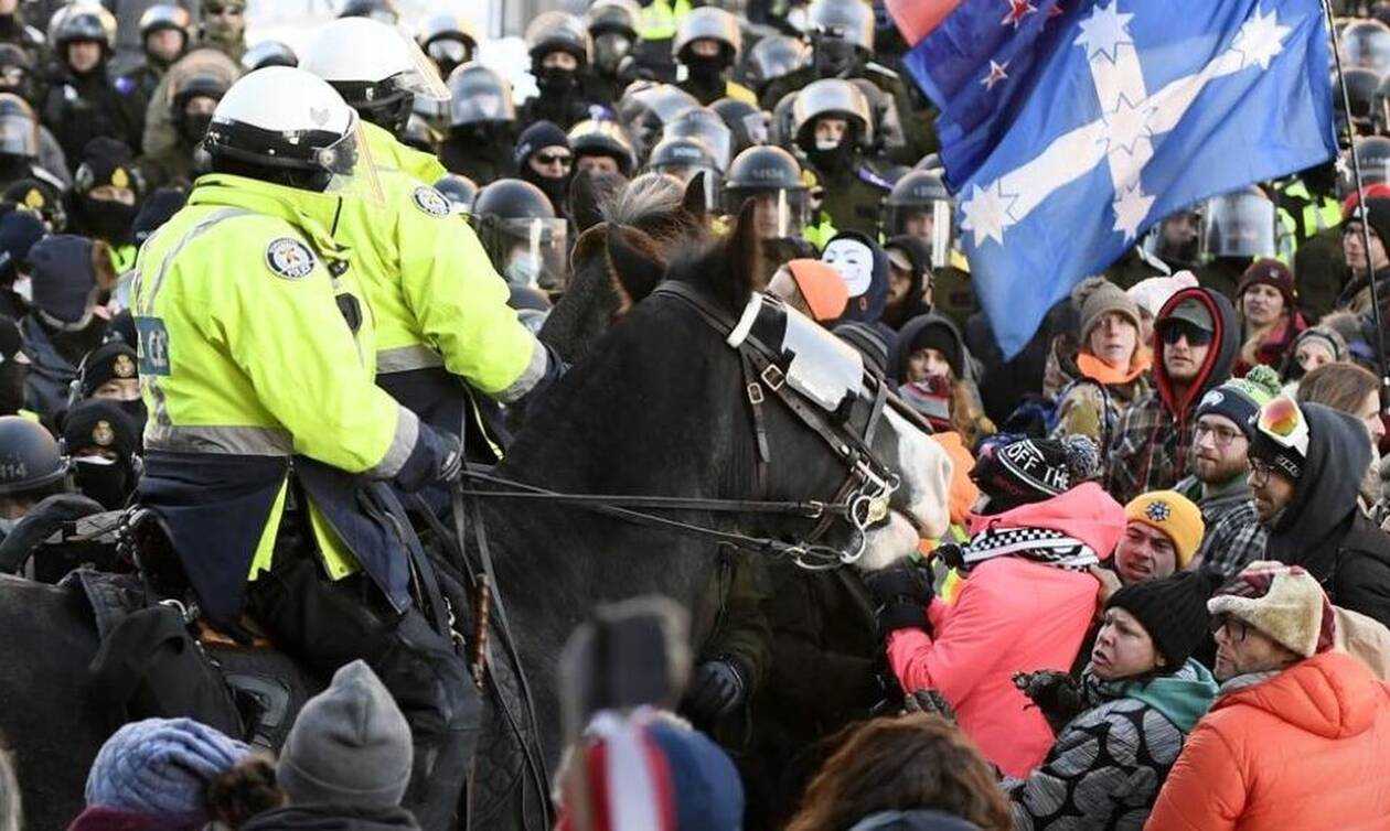 Σκηνές χάους εκτυλίχθηκαν στους δρόμους της πρωτεύουσας του Καναδά, όπου η αστυνομία συνέλαβε δεκάδες διαδηλωτές και ρυμούλκησε οχήματα, σε μία προσπάθεια να τερματίσει το «κονβόι της ελευθερίας». Σύμφωνα με πληροφορίες, πολίτες που διαμαρτύρονταν ειρηνικά κατά της υποχρεωτικότητας του εμβολιασμού και των αυστηρών μέτρων κατά της πανδημίας ποδοπατηθαν απο την έφιππη αστυνομία.