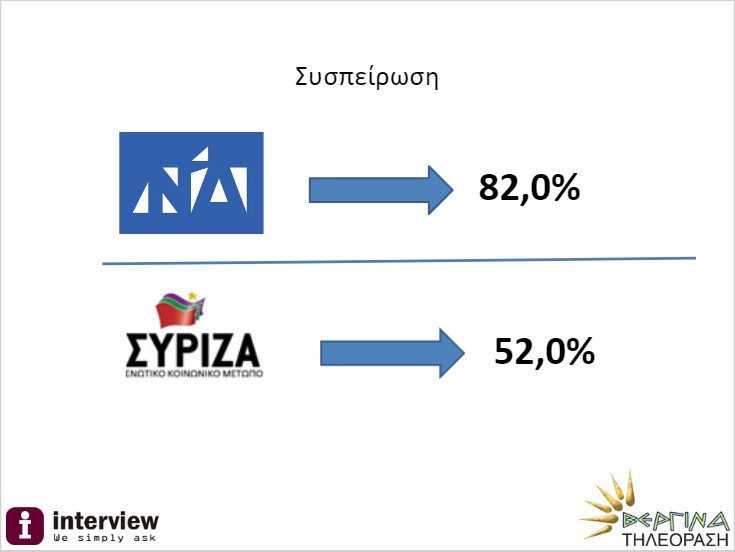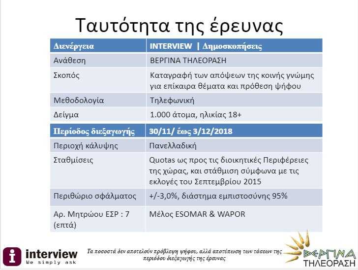 Προβάδισμα διατηρεί η Νέα Δημοκρατία έναντι του ΣΥΡΙΖΑ, το οποίο ανέρχεται στις 9,1 ποσοστιαίες μονάδες σύμφωνα με τη νέα πανελλαδική δημοσκόπηση της Interview για τη ΒΕΡΓΙΝΑ TV. Την ίδια ώρα ο ΣΥΡΙΖΑ, εμφανίζεται μετά τις ανακοινώσεις για παροχές και ελαφρύνσεις να έχει κερδίσει μισή ποσοστιαία μονάδα σε σχέση με την προηγούμενη δημοσκόπηση της Interview  για τη ΒΕΡΓΙΝΑ, ένα μήνα πριν, όταν συγκέντρωνε ποσοστό 21,9%. Στην νέα δημοσκόπηση, 5 κόμματα φαίνεται να περνούν το κατώφλι του 3%, στην Τρίτη θέση βρίσκεται η Χ.Α. με το ΚΙΝ.ΑΛ και το ΚΚΕ να ακολουθούν σε απόσταση αναπνοής.