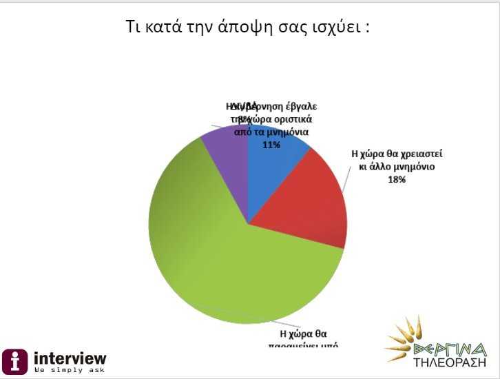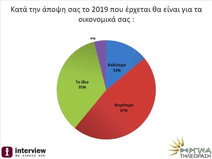 Σύμφωνα με τα ευρήματα έρευνας της εταιρίας Interview για λογαριασμό της ΒΕΡΓΙΝΑ TV, που  παρουσιάστηκαν στην εκπομπή του Στέργιου Καλόγηρου και της Φένιας Κλιάτση «Σχολιάζοντας την επικαιρότητα», άσχημη θα είναι η οικονομική κατάσταση των Ελλήνων την επόμενη χρονιά με μόλις το 14% των ερωτηθέντων να πιστεύει ότι το 2019 θα είναι καλύτερο για τα οικονομικά τους, ενώ μόλις το 11% εκτιμά ότι η κυβέρνηση έβγαλε οριστικά τη χώρα από τα μνημόνια.