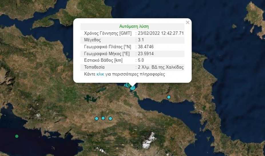Σεισμική δόνηση μεγέθους 3,1 βαθμών της κλίμακας Ρίχτερ σημειώθηκε στη Χαλκίδα την Τετάρτη 23 Φεβρουαρίου λίγο πριν τις 15.00, σύμφωνα με το Γεωδυναμικό Ινστιτούτο. Το επίκεντρο του σεισμού, εντοπίζεται 2 χιλιόμετρα βορειοδυτικά της Χαλκίδας και το εστιακό του βάθος είναι στα 5 χιλιόμετρα.