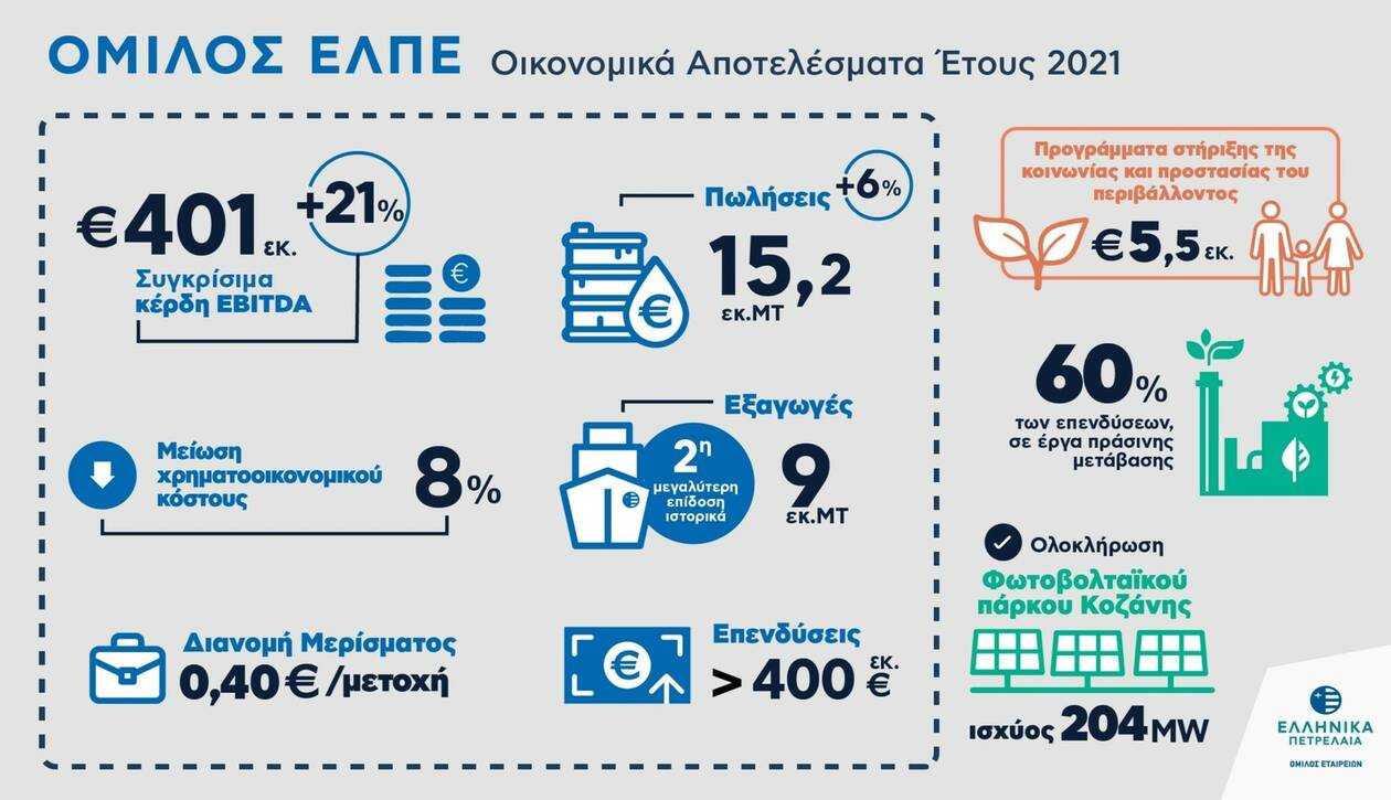 Στα 341 εκατ. ευρώ, διαμορφώθηκαν τα κέρδη των ΕΛΠΕ για το 2021, μέγεθος που αποτελεί τη δεύτερη υψηλότερη επίδοση στην ιστορία του Ομίλου, αναστρέφοντας τις περσινές ζημιές 397 εκατ. ευρώ, καθώς οι διεθνείς τιμές αργού ανέκαμψαν σημαντικά, από τα ιστορικά χαμηλά που κατέγραψαν το 2020. Τα ετήσια Συγκρίσιμα λειτουργικά Κέρδη (EBITDA) ανήλθαν σε 401 εκατ. ευρώ (+21%) και τα Συγκρίσιμα Καθαρά Κέρδη διαμορφώθηκαν στα 144 εκατ. ευρώ.