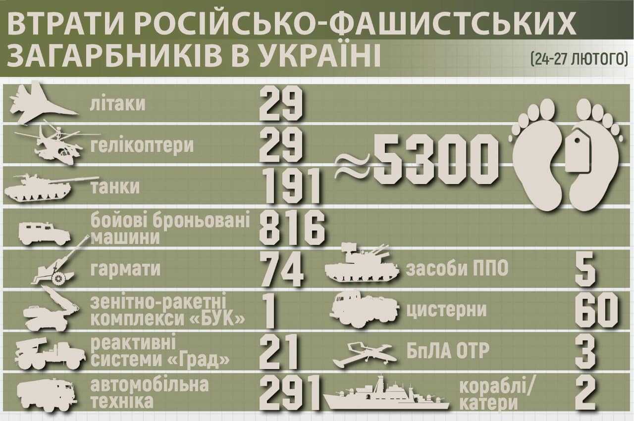 Συγκεκριμένα ο ρωσικός στρατός έχει χάσει κατά τις σφοδρές συγκρούσεις από την έναρξη του πολέμου στην Ουκρανία, πάνω από 5.300 στρατιώτες, 29 αεροπλάνα και 29 ελικόπτερα.