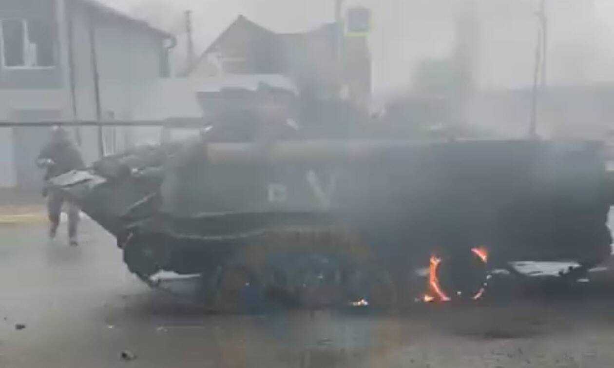 Βίντεο που αναρτήθηκαν στα μέσα κοινωνικής δικτύωσης δείχνουν Ουκρανούς στρατιώτες να περπατούν δίπλα σε κατεστραμμένα και καμένα οχήματα με το σύμβολο V που υποδηλώνει ότι ήταν μεταξύ των ρωσικών δυνάμεων που ήρθαν από τη Λευκορωσία.