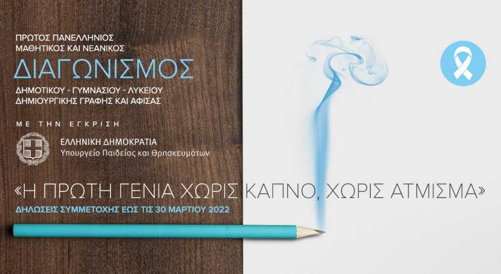 Παρατείνεται μέχρι τις 30 Μαρτίου 2022, η προθεσμία υποβολής συμμετοχών στον Πρώτο Πανελλήνιο Mαθητικό και Νεανικό Διαγωνισμό Δημιουργικής Γραφής και αφίσας «Η πρώτη γενιά χωρίς καπνό, χωρίς άτμισμα»  που διοργανώνει FairLife L.C.C.» για μαθητές Δημοτικού, Γυμνασίου και Λυκείου. Στόχος του διαγωνισμού είναι η ενημέρωση και η ευαισθητοποίηση των νέων για τις συνέπειες του καπνίσματος και του ατμίσματος ώστε οι συμμετέχοντες να συμβάλλουν στη δημιουργία κουλτούρας για την πρώτη γενιά που θα εξαφανίσει το κάπνισμα, την πρώτη γενιά χωρίς καπνό, χωρίς προϊόντα καπνού, χωρίς τσιγάρο, χωρίς ηλεκτρονικό τσιγάρο.