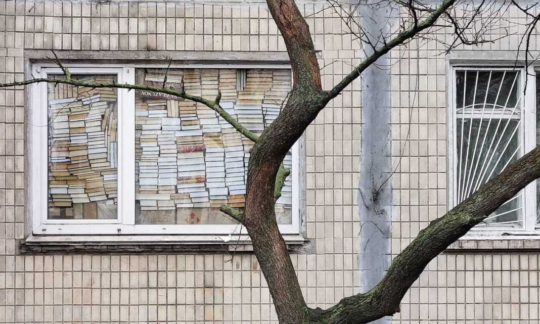 Η εικόνα δείχνει το παράθυρο ενός σπιτιού το οποίο έχει καλυφθεί από άκρη σε άκρη με βιβλία, σε μια προσπάθεια οχύρωσης από τις βόμβες που πλήττουν την ουκρανική πρωτεύουσα. Η δημοσιογράφος αναφέρει πως το συγκεκριμένο σπίτι ανήκει σε έναν Ουκρανό ερευνητή, τον Lev Shevchenko, ο οποίος με αυτόν τον τρόπο προσπαθεί να εμποδίσει τα γυαλιά από τα τζάμια να μπουν στο εσωτερικό του σπιτιού του.
