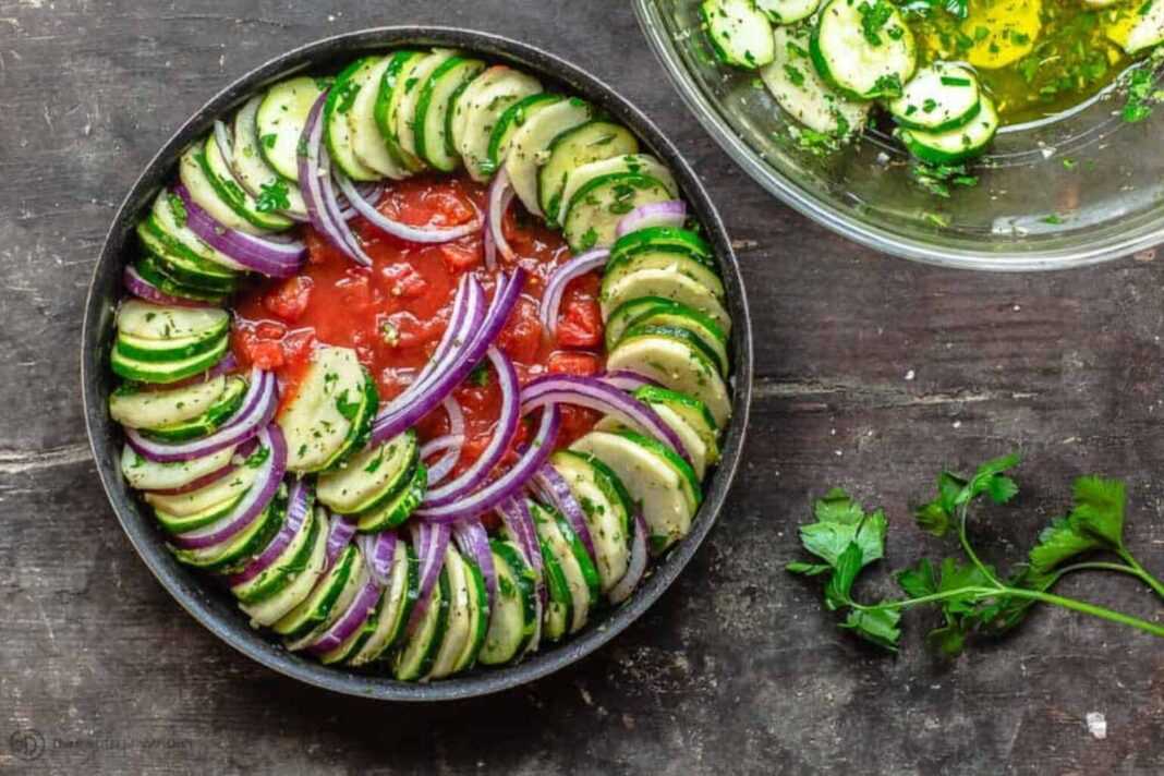 - Για να προετοιμάσετε αυτή τη νόστιμη συνταγή μπριάμ, ξεκινήστε προετοιμάζοντας τα λαχανικά σας. Ξεφλουδίστε και κόψτε τις πατάτες σε φέτες. Πλύντε καλά τα κολοκυθάκια και τις μελιτζάνες και κόψτε σε φέτες 1 εκατοστού. Εναλλακτικά, μπορείτε να κόψετε τα λαχανικά σε κομμάτια. Ξεφλουδίστε τις ντομάτες και κόψτε σε λεπτές φέτες. Μπορείτε επίσης να χρησιμοποιήσετε πράσινες πιπεριές.