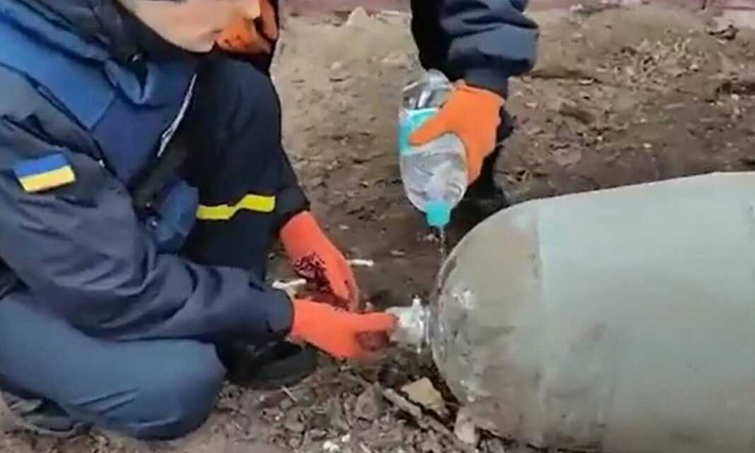 Οι δύο Ουκρανοί φαίνονται να έχουν γονατίσει δίπλα στη βόμβα και να ξεβιδώνουν με προσοχή το καπάκι της χρησιμοποιώντας μόνο ένα μικρό μπουκάλι νερό και τα γάντια τους.