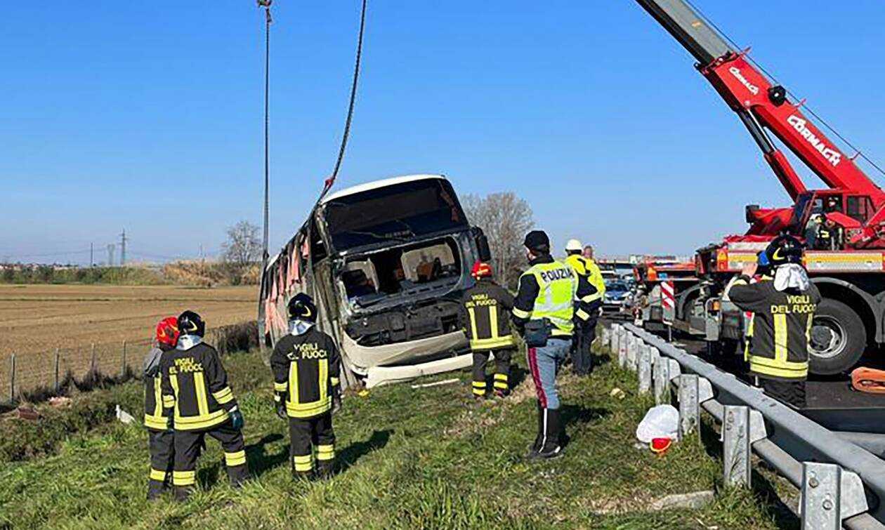 Στα πλάνα που κατέγραψαν οι υπηρεσίες διάσωσης διακρίνεται το λεωφορείο να έχει πέσει με τη μία πλευρά μέσα σε ένα χαντάκι, σε έναν δρόμο νοτιοανατολικά της Μπολόνιας, μετά το δυστύχημα που σημειώθηκε νωρίς το πρωί της Κυριακής.