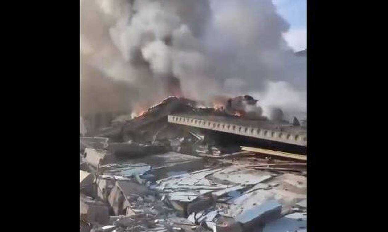 Το βίντεο δείχνει τις αρχές να προσπαθούν να σβήσουν τη φωτιά που καίει ακόμη ένα κατεστραμμένο κτήριο.