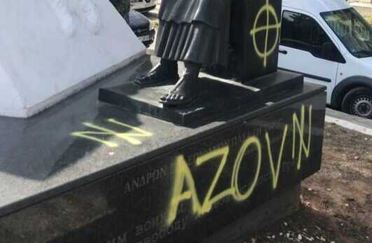 Οι άγνωστοι, δεν δίστασαν να γράψουν πάνω στις πλάκες την λέξη «Azov», προφανώς παραπέμποντας στο ναζιστικό τάγμα της Ουκρανίας, το οποίο για πολλά χρόνια έσφαζε (και συνεχίζει να σφάζει) ρωσόφωνους πολίτες.