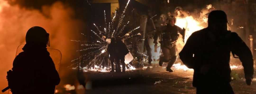 Κουκουλοφόροι πετούν βόμβες μολότοφ, πέτρες και αλλά αντικείμενα και τις αστυνομικές δυνάμεις να προσπαθούν να τους απωθήσουν κάνοντας χρήση χημικών.
