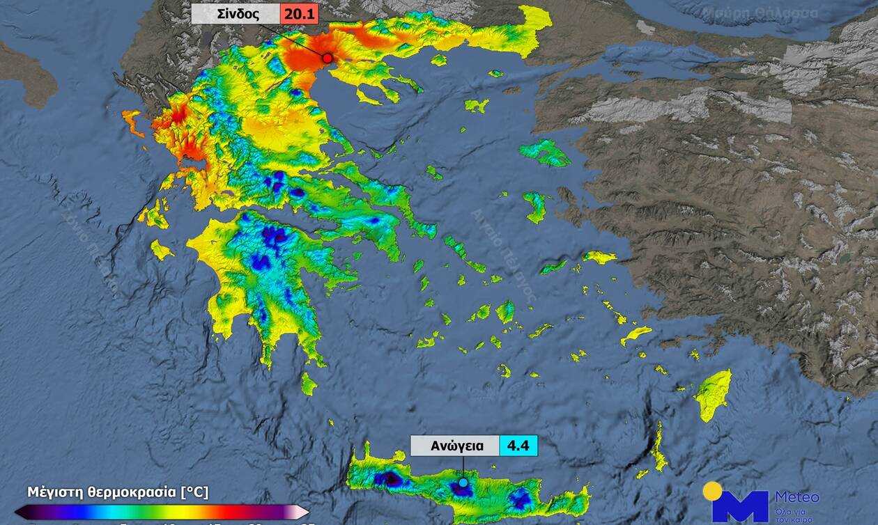 Σύμφωνα με το δίκτυο των αυτόματων μετεωρολογικών σταθμών του Εθνικού Αστεροσκοπείου Αθηνών/meteo.gr, η μέγιστη θερμοκρασία στη Σίνδο Θεσσαλονίκης ανήλθε στους 20,1 βαθμούς, ενώ στα Ανώγεια Ρεθύμνου δεν ξεπέρασε τους 4,4 βαθμούς.