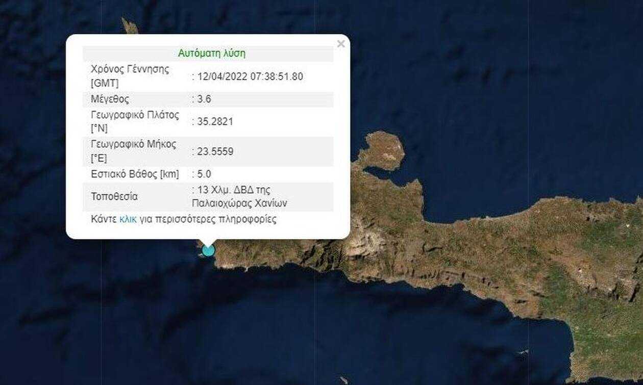 Σεισμός μεγέθους 3,6 Ρίχτερ σημειώθηκε το πρωί της Τρίτης στην Κρήτη και συγκεκριμένα κοντά στην Παλαιόχωρα Χανίων.