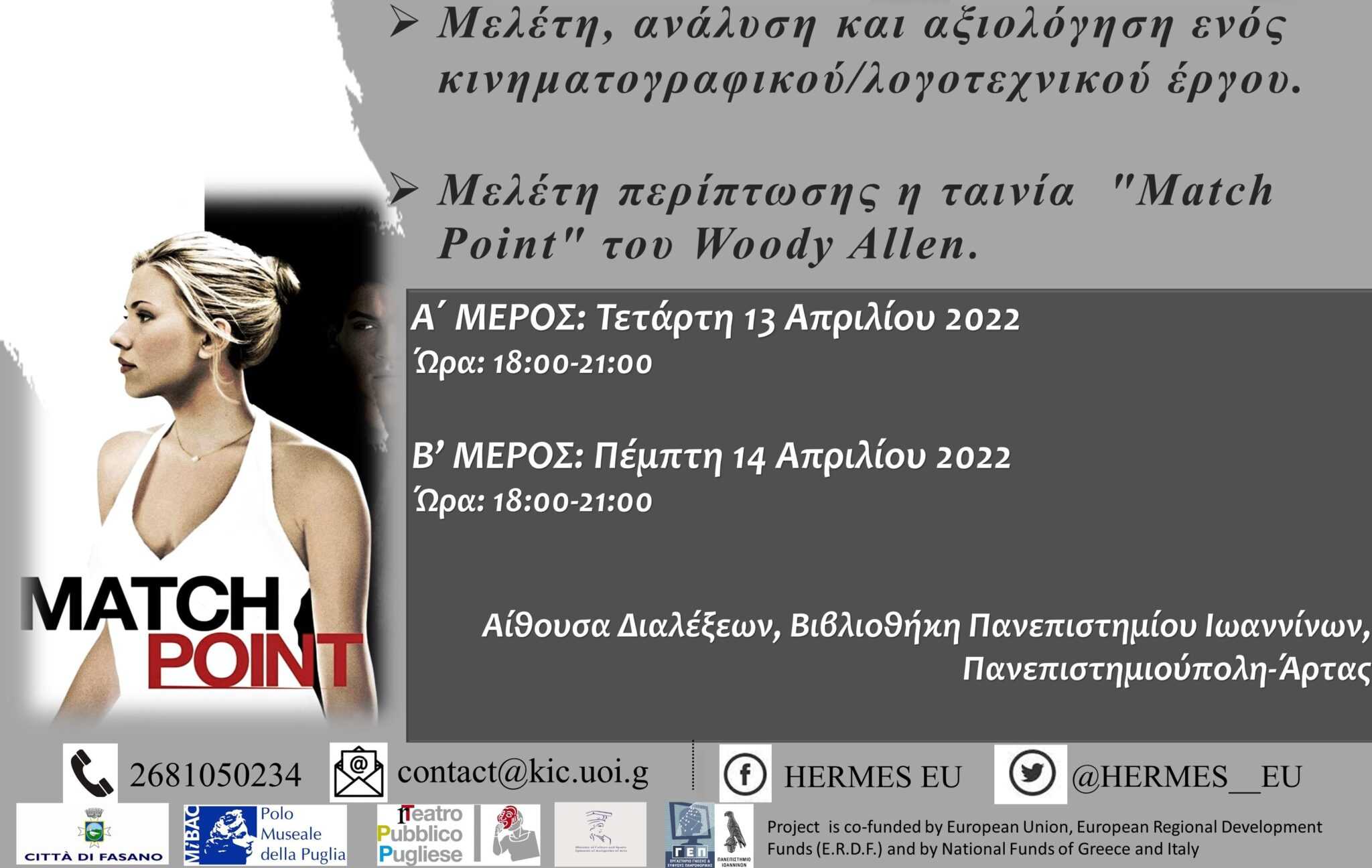 Σειρά διαλέξεων του Αρτινού σκηνοθέτη και παραγωγού, Δρ. Γιάννη  Κώστα με θέμα:  «Μελέτη, ανάλυση και αξιολόγηση ενός κινηματογραφικού/λογοτεχνικού έργου. Μελέτη περίπτωσης η ταινία  “Match Point” του Woody Allen» θα πραγματοποιηθούν την Τετάρτη 13 & Πέμπτη 14 Απριλίου και ώρες 18.00-21.00 στην Αίθουσα Διαλέξεων της Βιβλιοθήκης του Πανεπιστημίου Ιωαννίνων στην Πανεπιστημιούπολη Άρτας, στους Κωστακιούς.