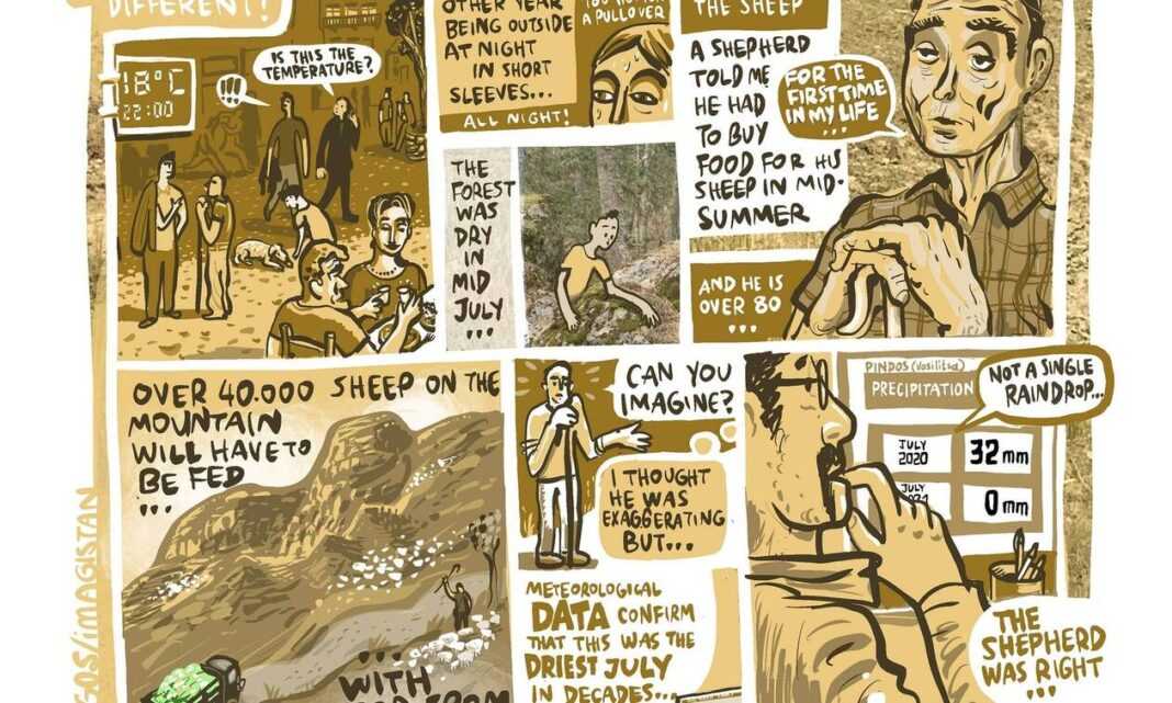 Το δροσερό αεράκι που τον ανάγκαζε να κουβαλάει πάντα μαζί του το καλοκαίρι ένα πουλόβερ έχει αντικατασταθεί από την αποπνικτική, ζεστή και ξηρή ατμόσφαιρα. Η ξηρασία στο δάσος είναι πλέον εμφανής και τα πρόβατα που βοσκούσαν στα χωράφια και τρέφονταν από το πλούσιο γρασίδι, βρίσκουν με δυσκολία την τροφή τους. Αρκετά χιλιάδες χιλιόμετρα μακριά, στο Πόρβοο της Φινλανδίας, ο χαρακτήρας που έχει σχεδιάσει η εικονογράφος Κάισα Λέκα, δυσφορεί με τον φετινό χειμώνα. Βροχές με ήλιο, χιόνια, λιακάδα, περίεργες θερμοκρασίες και παγωμένους δρόμους ήταν όλα όσα αντίκριζε από το παράθυρό του όλο τον Ιανουάριο του 2022. Η εικόνα της κλιματικής αλλαγής φαίνεται από όποιο παράθυρο κι αν ανοίξει κάποιος, όπου κι αν βρίσκεται, στην Αυστρία, στην Ολλανδία, στην Τουρκία, στην Ελλάδα. Αυτό είναι το μήνυμα που θέλει να περάσει η Ολλανδή εικονογράφος- δημοσιογράφος Εύα Χίλχορστ μέσα από το πρότζεκτ της «Window Comics», Climate Change before our eyes .