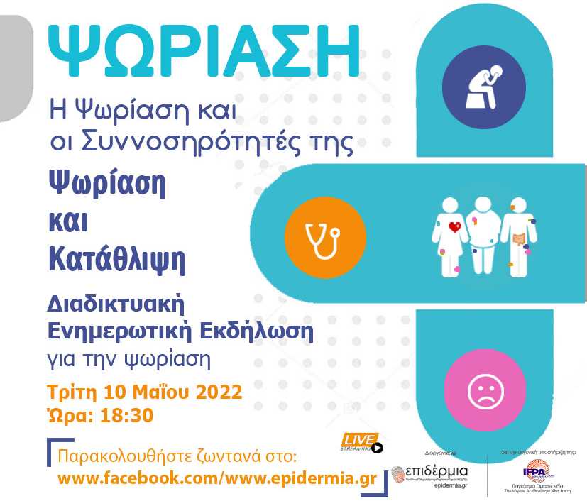 Ο Πανελλήνιος Σύλλογος Ασθενών με Ψωρίαση και Ψωριασική Αρθρίτιδα, Επιδέρμια, στα πλαίσια της καμπάνιας με τίτλο ΨΩΡΙΑΣΗ +, η οποία εστιάζει στις συννοσηρότητες της ψωρίασης, διοργανώνει διαδικτυακή ενημερωτική εκδήλωση, ανοιχτή στο κοινό, την Τρίτη 10 Μαΐου 2022, στις 18:30, με θέμα την Ψωρίαση και την Κατάθλιψη.