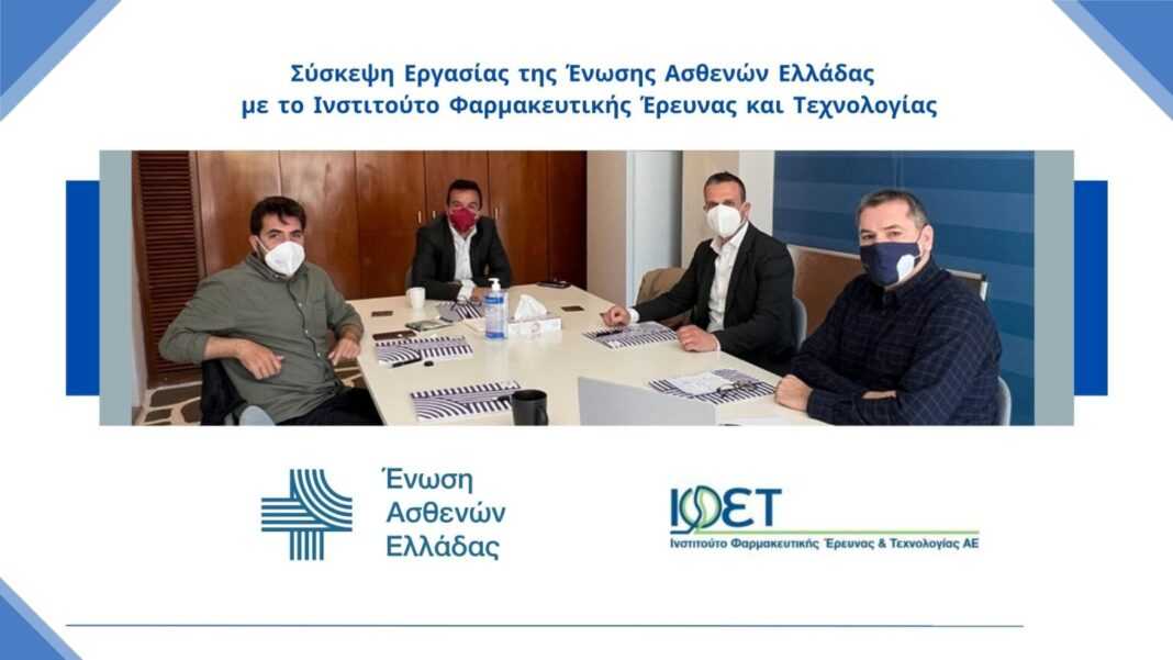 Την Τετάρτη 20 Απριλίου 2022, η Ένωση Ασθενών Ελλάδας πραγματοποίησε συνάντηση εργασίας με τον κ. Ιωάννη Σωτηρίου, Διευθύνοντα Σύμβουλο του Ινστιτούτου Φαρμακευτικής Έρευνας και Τεχνολογίας. Κατά τη διάρκεια της σύσκεψης εργασίας, η συζήτηση επικεντρώθηκε μεταξύ άλλων στην ανάγκη για τη βελτιστοποίηση των διαδικασιών και συντονισμού συνεργασίας του ΙΦΕΤ με τον Εθνικό Οργανισμό Φαρμάκων (ΕΟΦ) και τον Εθνικό Οργανισμό Παροχής Υπηρεσιών Υγείας (ΕΟΠΥΥ). Δεδομένου του ισχυρού ψηφιακού εκσυγχρονισμού που πραγματοποιείται στα συστήματα του ΙΦΕΤ έπειτα από πολυετείς διεργασίες, η εγκαθίδρυση μιας σύγχρονης αλυσίδας επικοινωνίας μεταξύ των φορέων είναι πλέον εφικτή. Κατά τη διάρκεια της σύσκεψης, και οι δύο πλευρές συμφώνησαν από κοινού ότι πρωταρχικός στόχος οφείλει να είναι η πλήρης ενημέρωση όλων των ενδιαφερόμενων μερών, και η απρόσκοπτη ροή πληροφορίας, που θα καταρρίψει πιθανά κωλύματα στις διαδικασίες εισαγωγής φαρμακευτικών σκευασμάτων. Για αυτό το σκοπό, συζητήθηκε σε βάθος η δημιουργία ψηφιακών εφαρμογών, οι οποίες θα συντελέσουν στη διεκπεραίωση των ανωτέρω ζητημάτων.