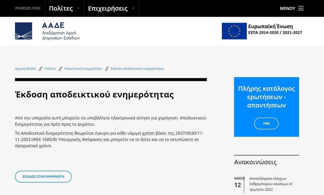 1. Κάθε φυσικό ή νομικό πρόσωπο ή νομική οντότητα δύναται να αιτηθεί, μέσω ειδικής πλατφόρμας προσβάσιμης μέσω της Ενιαίας Ψηφιακής Πύλης της Δημόσιας Διοίκησης (gov.gr-ΕΨΠ), την έκδοση ενιαίου πιστοποιητικού οικονομικής ενημερότητας. Το πιστοποιητικό περιλαμβάνει τα στοιχεία του αποδεικτικού ενημερότητας των παρ. 1 και 4 του άρθρου 12 του Κώδικα Φορολογικής Διαδικασίας [ν. 4174/2013, (Α’ 170)] και του αποδεικτικού ασφαλιστικής ενημερότητας του άρθρου 24 του ν. 4611/2019 (Α’ 73) και φέρει τα χαρακτηριστικά της παρ. 3 του άρθρου 27 του ν. 4727/2020 (Α’ 184) ως έγγραφο που εκδίδεται μέσω της ΕΨΠ.