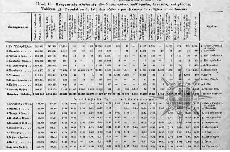 Η απογραφή του 1928 έχει ιδιαίτερη σημασία για την Ελλάδα, καθώς είναι η πρώτη μετά την υποχρεωτική ανταλλαγή πληθυσμών μεταξύ Ελλάδας και Τουρκίας, μετά τη Μικρασιατική Καταστροφή. Τα αποτελέσματά της έχουν εξαιρετικό ενδιαφέρον και είναι προσβάσιμα σε όλους μας στο διαδίκτυο, μια και έχουν ψηφιοποιηθεί και είναι ελεύθερα προσβάσιμα. Ένας εξαιρετικά ενδιαφέρων πίνακας απεικονίζει τον «πραγματικόν πληθυσμόν διαμερισμάτων καθ’ ομάδας θρησκείας και γλώσσης», κατατάσσει δηλαδή τον πληθυσμό της χώρας με βάση τη θρησκεία και τη γλώσσα που δήλωσαν οι απογραφόμενοι. Ας δούμε μερικά στοιχεία από τον πίνακα αυτό, κι ο καθείς ας βγάλει τα συμπεράσματά του.