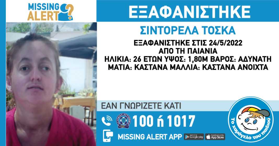 Σύμφωνα με το Missing Alert που εκδόθηκε η Τόσκα Σιντορέλα, όπως είναι το όνομα της 26χρονης, το «Χαμόγελο του Παιδιού» ενημερώθηκε για την εξαφάνιση στις 25/05/2022 και προχώρησε στη δημοσιοποίηση των στοιχείων της ενήλικης κατόπιν αιτήματος της οικογένειάς της, καθώς ενδέχεται να συντρέχουν λόγοι οι οποίοι θέτουν τη ζωή της σε κίνδυνο.