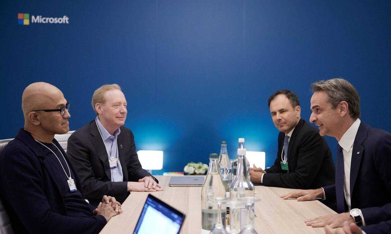 Ο Πρωθυπουργός Κυριάκος Μητσοτάκης συναντήθηκε σήμερα με τον Πρόεδρο του Διοικητικού Συμβουλίου και Διευθύνοντα Σύμβουλο της Microsoft Satya Nadella και τον Πρόεδρο της εταιρείας Brad Smith, στο πλαίσιο των εργασιών του Παγκόσμιου Οικονομικού Φόρουμ, στο Νταβός.