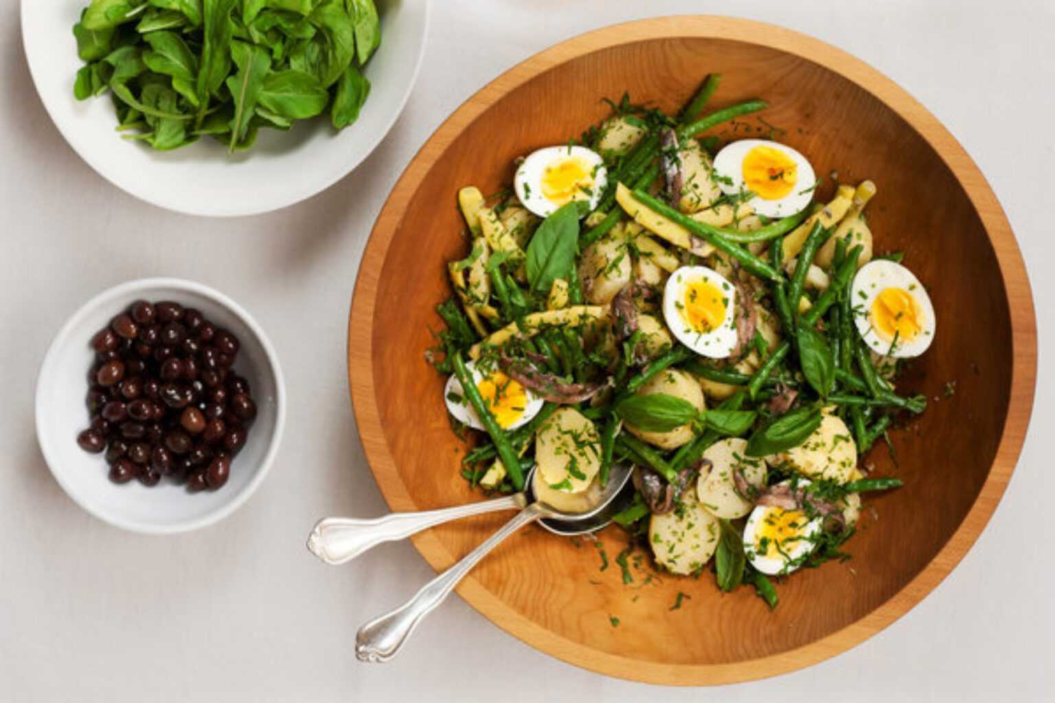 Βράζουμε τις πατάτες σε κατσαρόλα με νερό που σιγοβράζει για 5 λεπτά. Προσθέτουμε τα φασόλια και μαγειρεύουμε άλλα 5 λεπτά, στη συνέχεια ρίχνουμε τον αρακά και μαγειρεύουμε για 2 λεπτά μέχρι να μαλακώσουν όλα τα λαχανικά. Εν τω μεταξύ, βράζουμε τα αυγά σε άλλο τηγάνι για 8 λεπτά. Τα στραγγίζουμε και τα περνάμε κάτω από κρύο νερό και μετά τα ξεφλουδίζουμε προσεκτικά και τα κόβουμε στη μέση.