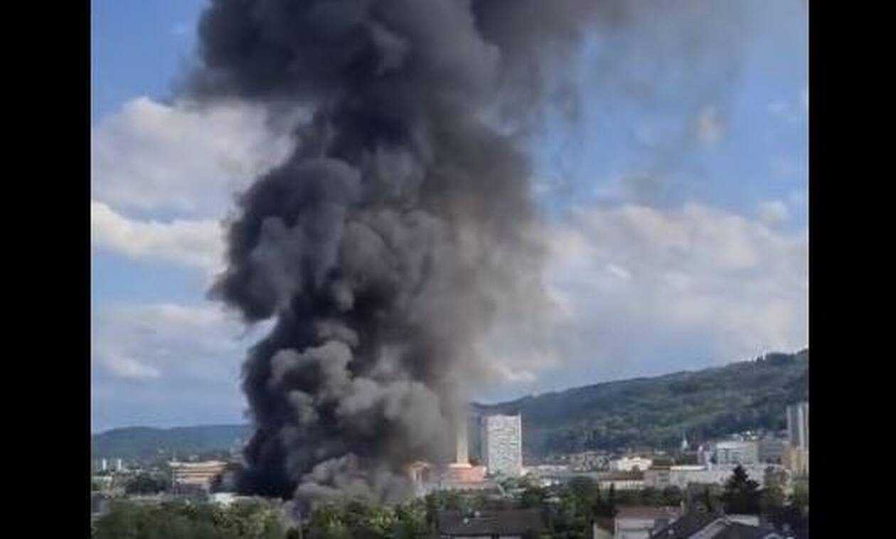 Πυκνός μαύρος καπνός είναι ορατός από μίλια μακριά από τη μεγάλη φωτιά σε βιομηχανικό κτήριο έξω από τη Ζυρίχη