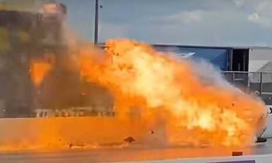 Στο βίντεο που κατέγραψαν θεατές του αγώνα φαίνεται το όχημα να ξεκινά αλλά μέσα σε λίγα δευτερόλεπτα να χτυπάει στα προστατευτικά και να παίρνει φωτιά μετά από έκρηξη.