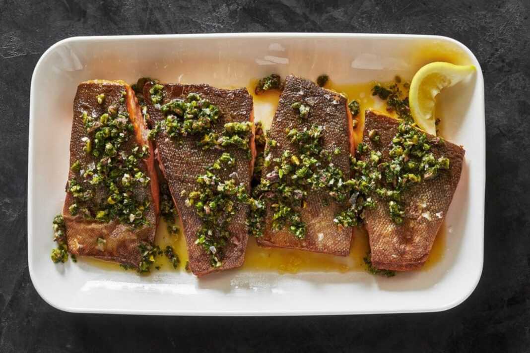 Το μόνο που πρέπει να κάνουμε είναι να πάρουμε ένα μεσαίο μπολ να ανακατεύσουμε τον μαϊντανό, τα φιστίκια Αιγίνης, το σκόρδο, το ξύσμα και το χυμό λεμονιού και 1/4 κ.σ. αλάτι. Ανακατεύουμε με ελαιόλαδο και αφήνουμε. Έπειτα αλατοπιπερώνουμε και από τις δύο πλευρές με το υπόλοιπο 1/2 κ.σ. αλάτι. Σε ένα μεγάλο τηγάνι σε μέτρια προς δυνατή φωτιά, ζεσταίνουμε 1 1/2 κ.σ. φυτικό λάδι μέχρι να είναι πολύ ζεστό και να γυαλίζει. Περιστρέψτε το τηγάνι για να το αλείψετε με λάδι. Τοποθετήστε προσεκτικά τα 2 φιλέτα ψαριού με τη φλούδα προς τα κάτω στο τηγάνι και μαγειρέψτε, ανενόχλητα, μέχρι να ροδίσουν οι άκρες του δέρματος, για 3 έως 4 λεπτά. Αναποδογυρίστε και συνεχίστε να μαγειρεύετε μέχρι να ψηθεί το ψάρι και να ροδίσει η κάτω πλευρά, για 1 με 2 λεπτά. Μεταφέρετε σε μια πιατέλα με το δέρμα προς τα πάνω. Επαναλάβετε με το υπόλοιπο φυτικό λάδι και τα ψάρια. Πασπαλίζετε το ψάρι με gremolata και φιστίκι αν σερβίρετε αμέσως, διαφορετικά σερβίρετε στο πλάι. Περιχύστε με ελαιόλαδο και πασπαλίστε με θαλασσινό αλάτι, αν χρησιμοποιείτε. Σερβίρετε μαζί με φέτες λεμονιού.