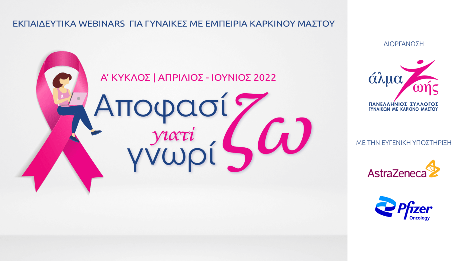 Με μεγάλη επιτυχία ολοκληρώθηκε ο Α’ Κύκλος των εκπαιδευτικών webinars για γυναίκες με εμπειρία καρκίνου μαστού «Αποφασίζω γιατί Γνωρίζω» για το 2022, που διοργανώνει για 14η συνεχή χρονιά ο Πανελλήνιος Σύλλογος Γυναικών με Καρκίνο Μαστού «Άλμα Ζωής». Το πρόγραμμα πραγματοποιείται διαδικτυακά δίνοντας την ευκαιρία σε ασθενείς από όλη την Ελλάδα να λάβουν μέρος.