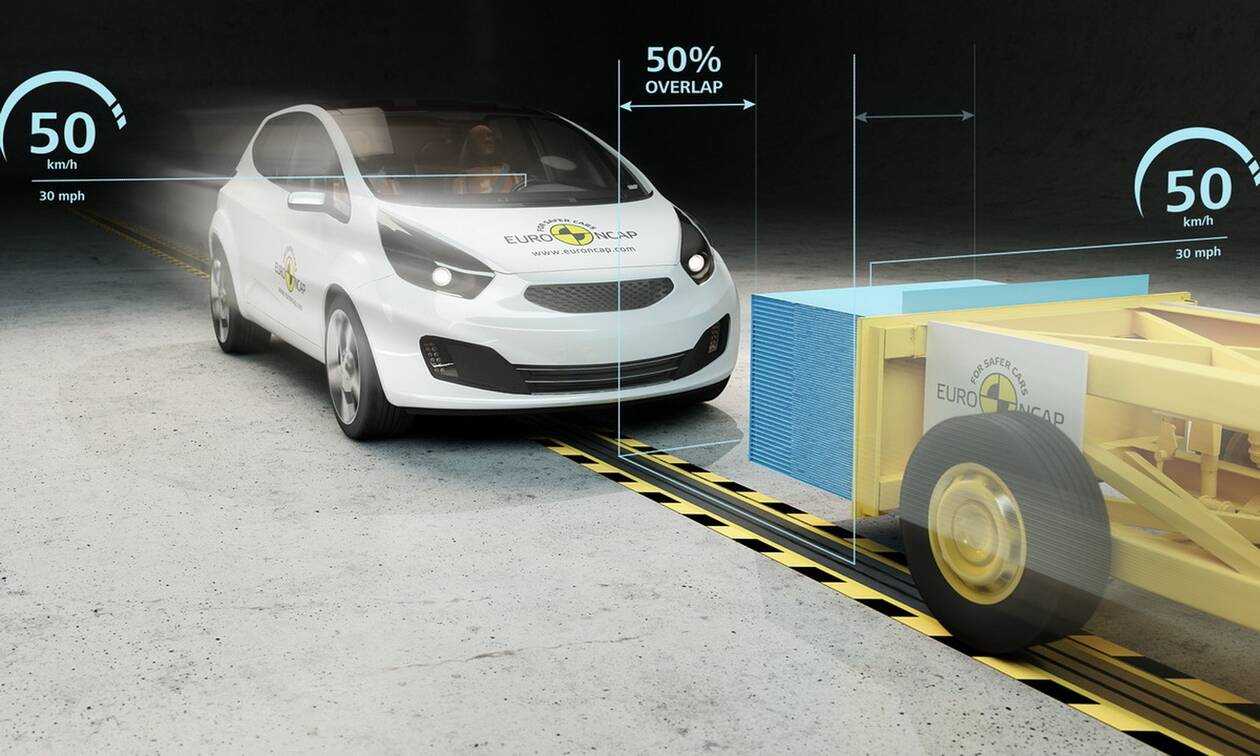 Στην περίπτωση των δοκιμών του Euro NCAP, αυτές περιλαμβάνουν τη μετωπική πρόσκρουση που αποτελείται από δύο δοκιμές. Η πρώτη δοκιμασία είναι μια πλήρης μετωπική πρόσκρουση σε ακίνητο τοίχο με ταχύτητα 50 χλμ/ώρα, ενώ η δεύτερη δοκιμή γίνεται με το όχημα να συγκρούεται με ένα κινητό εμπόδιο βάρους 1.400 κιλών, το οποίο έχει σχεδιαστεί για να προσομοιώνει ένα μέσο αυτοκίνητο στο δρόμο. Τόσο το αυτοκίνητο δοκιμής όσο και το εμπόδιο κινούνται με 50 χλμ/ώρα. Η περιοχή πρόσκρουσης περιλαμβάνει το 50% της μετωπικής περιοχής του οχήματος.