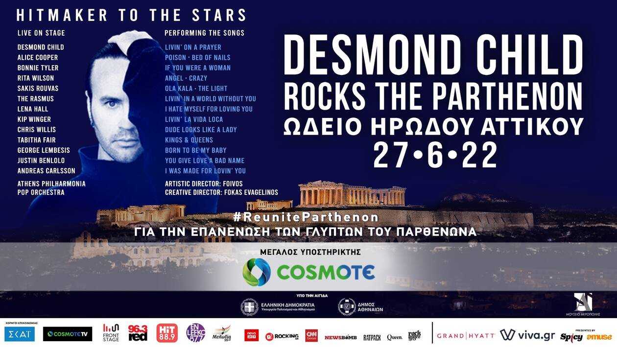Ο θρυλικός συνθέτης και παραγωγός Desmond Child έρχεται στην Ελλάδα και ενώνει τις δυνάμεις του με τα λαμπρότερα ονόματα της παγκόσμιας μουσικής σκηνής, σε μία μοναδική συναυλία – αφιέρωμα στον ελληνικό πολιτισμό: «DESMOND CHILD ROCKS THE PARTHENON!», με Μεγάλο Υποστηρικτή την COSMOTE.