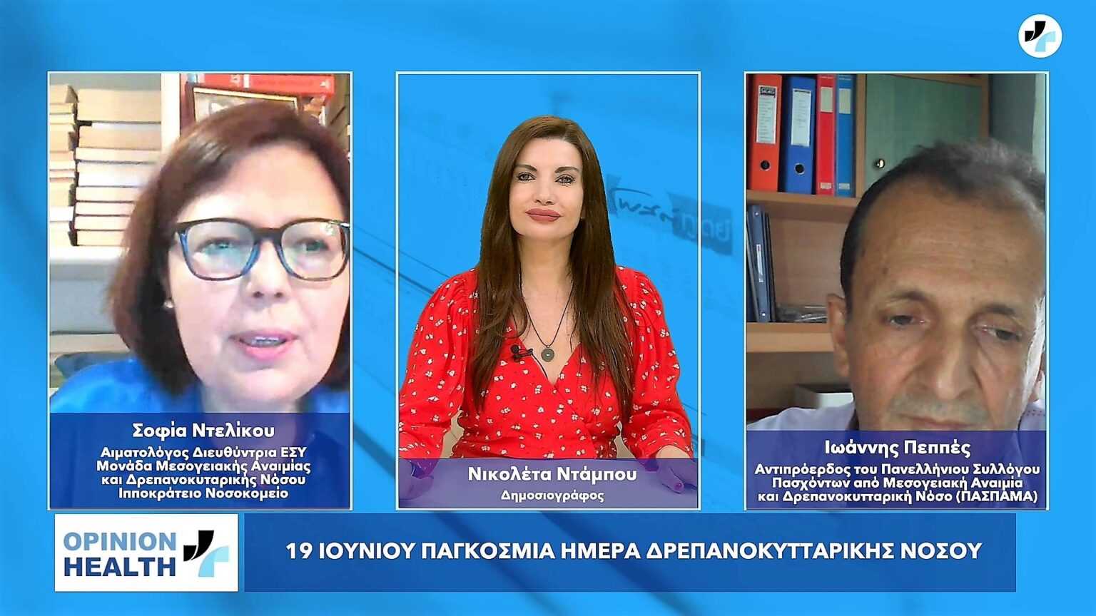 Η σημερινή εκπομπή Opinion Health είναι αφιερωμένη στη δρεπανοκυτταρική νόσο ,με αφορμή την παγκόσμια ημέρα Δρεπανοκυτταρικής Νόσου 19 Ιουνίου 2022 και για το σκοπό αυτό φιλοξενεί την κ. Σοφία Ντελίκου η οποία είναι αιματολόγος Διευθύντρια ΕΣΥ στην Μονάδα Μεσογειακής Αναιμίας και Δρεπανοκυταρικής Νόσου στο Ιπποκράτειο Νοσοκομείο και τον κ. Ιωάννη Πεππέ, ο οποίος είναι Αντιπρόεδρος του Πανελλήνιου Συλλόγου Πασχόντων με Μεσογειακή Αναιμία και Δρεπανοκυτταρική Νόσο (ΠΑΣΠΑΜΑ).