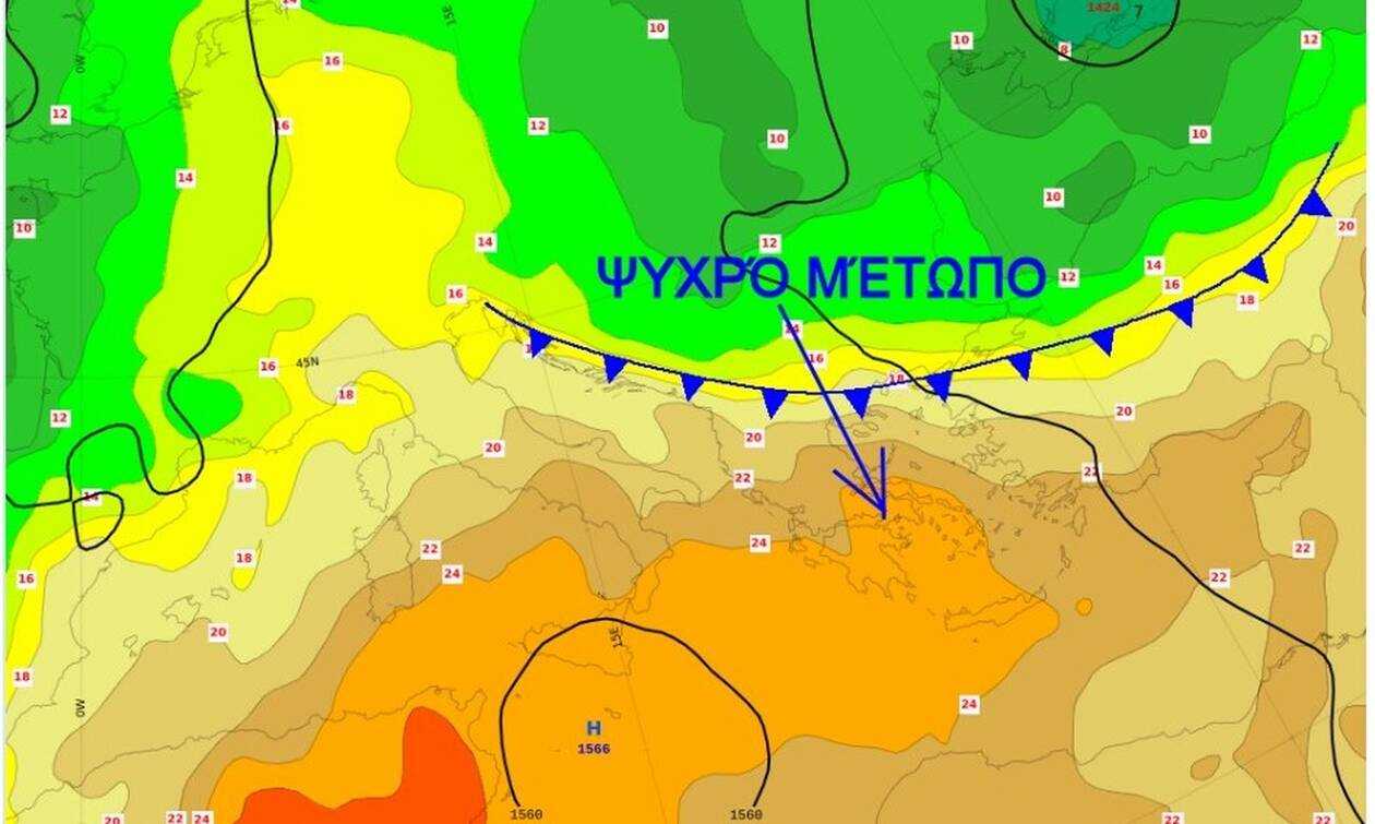 Το μέτωπο αυτό θα ρίξει αισθητά την θερμοκρασία και στους προγνωστικούς χάρτες το βράδυ της Παρασκευής προς Σάββατο εμφανίζεται να περνά πάνω από την Αθήνα η ισόθερμη των 15 βαθμών Κελσίου.