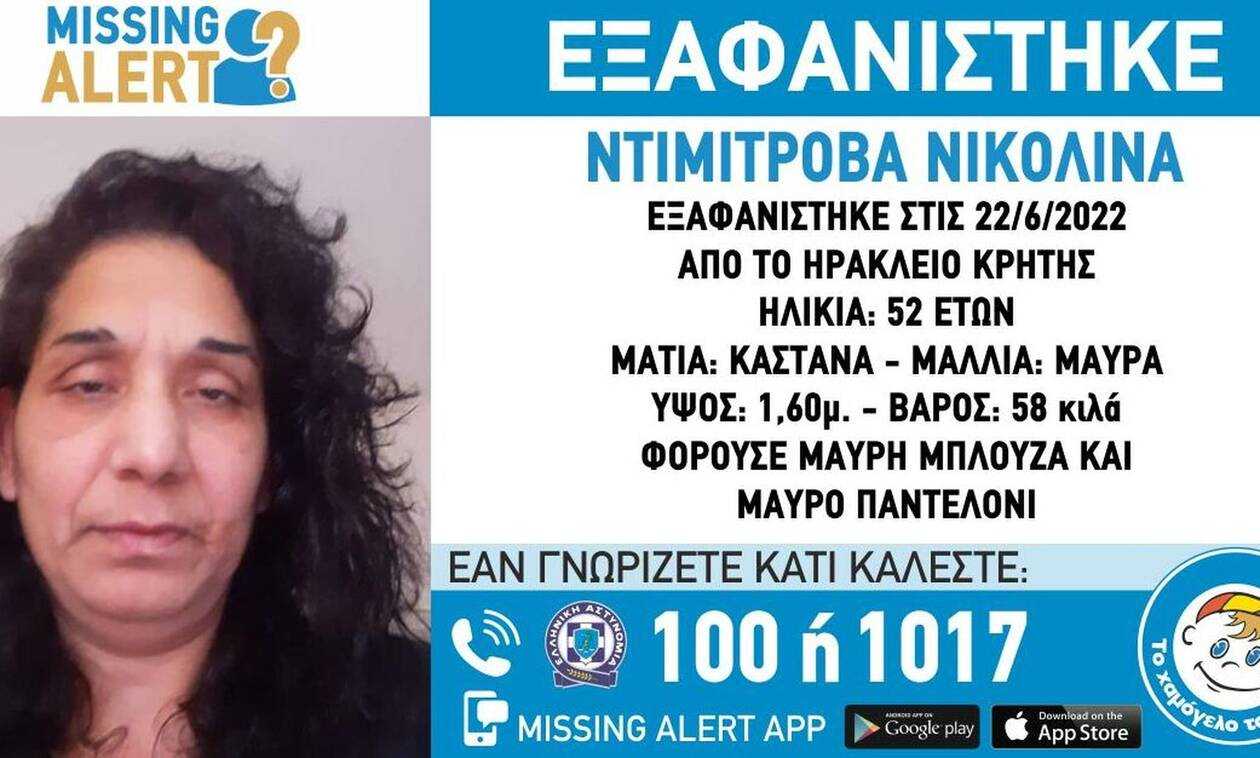 Το «Χαμόγελο του Παιδιού» ενεργοποίησε το Missing Alert σήμερα 4 Ιουλίου για την εξαφάνιση της 52χρονης Νικολίνα Ντιμίτροβα, στο Ηράκλειο Κρήτης στις 22 Ιουνίου 2022.