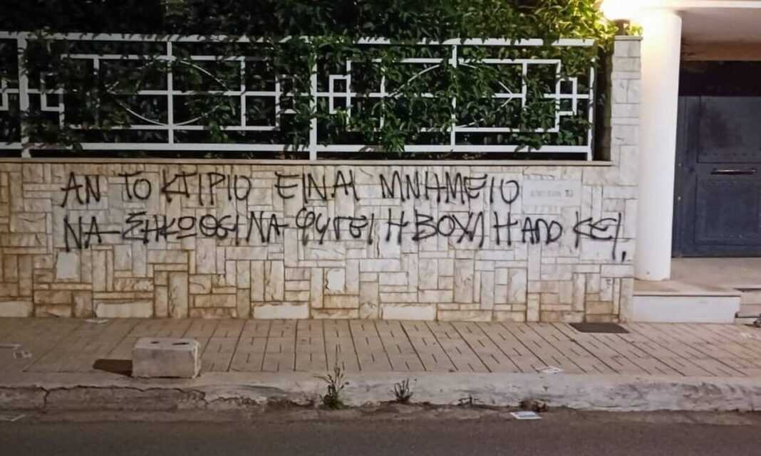 «Επίθεση» με συνθήματα στους τοίχους και τρικάκια στο σπίτι του Γενικού Γραμματέα της Βουλής, Γιώργου Μυλωνάκη, πραγματοποίησαν μέλη του «Ρουβίκωνα» το βράδυ της Πέμπτης.