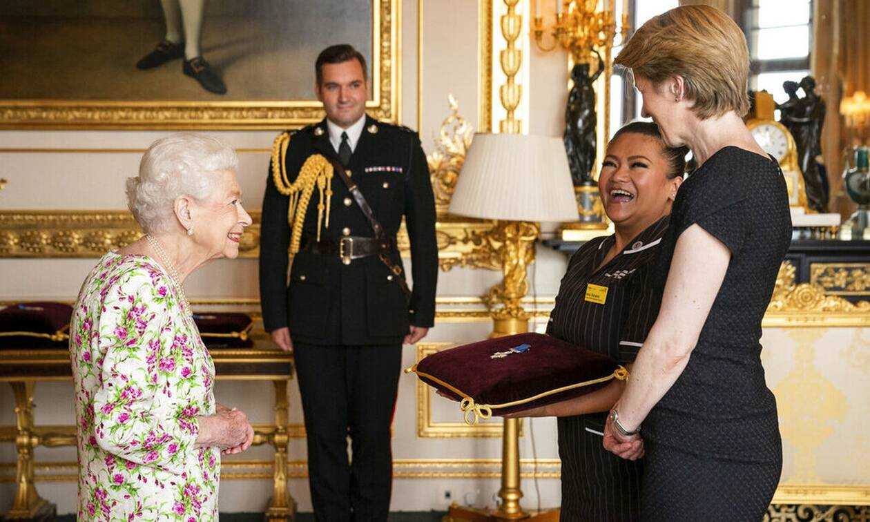 Στην μικρκή αυτή τελετή στην οποία συμμετείχε και ο πρίγκιπας Κάρολος, η Βασίλισσα τίμησε τους υγειονομικούς με τον Σταυρό του Βασιλιά Γεωργίου επαινώντας τους εργαζομένους στα νοσοκομεία της χώρας για τους εμβολιασμούς κατά του κορονοϊού.