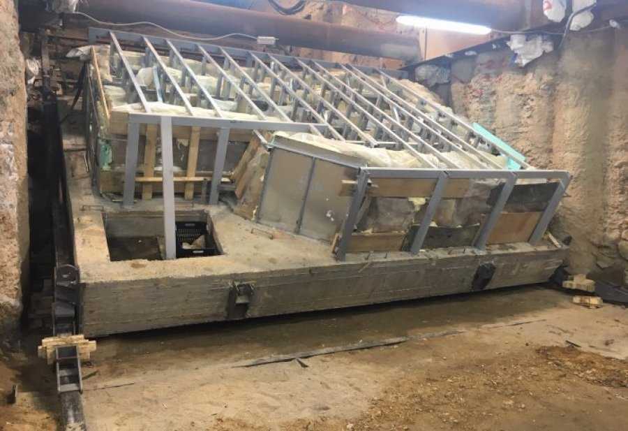 Στηριζόμενο σε έναν ειδικά διαμορφωμένο νάρθηκα από μεταλλικές δοκούς και οπλισμένο σκυρόδεμα, παίρνοντας κλίση 30ο μοιρών και κυλώντας για περισσότερο από δέκα ώρες πάνω σε κεκλιμένες μεταλλικές ράγες κατάφερε να βγει την Πέμπτη (13/12) στην επιφάνεια της γης. Είναι πρώτη φορά που γίνεται κατασκευή ανύψωσης μνημείου σε κεκλιμένο επίπεδο έχοντας και η ίδια η κατασκευή ανηφορική θέση 30ο μοιρών. Την διαδικασία απόσπασης ανέλαβε μία τεχνική εταιρία με έδρα το Βόλο, η SLM, η οποία εκτελεί τα μεγαλύτερα έργα απόσπασης και μεταφοράς κρίσιμων-ευαίσθητων αρχαιολογικών συνόλων στη χώρα. Με χειρουργικές επεμβάσεις και σε συνεργασία με τον αρχιτέκτονα Δημήτρη Κορρέ έχει αποσπάσει και μεταφέρει 15 συνολικά σπάνια αρχαιολογικά ευρήματα από το 2012.