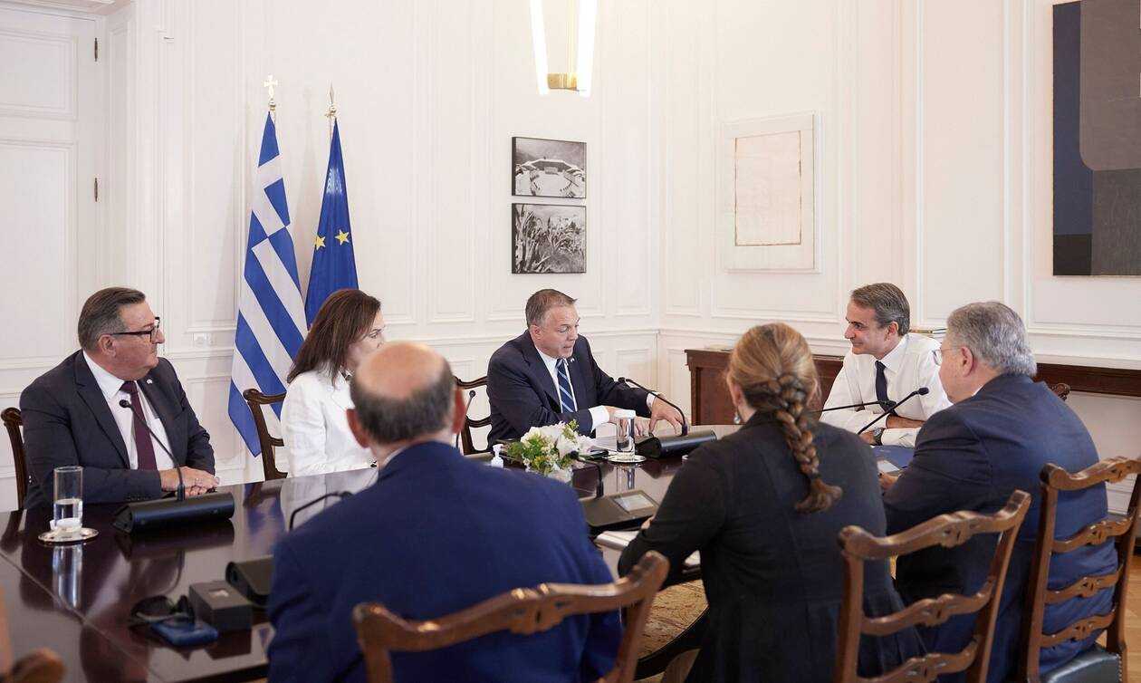 Ο Πρωθυπουργός Κυριάκος Μητσοτάκης υποδέχθηκε το πρωί, στο Μέγαρο Μαξίμου, το Διοικητικό Συμβούλιο της Παγκόσμιας Διακοινοβουλευτικής Ένωσης Ελληνισμού (ΠαΔΕΕ), υπό τον Πρόεδρό της, Πολιτειακό Γερουσιαστή του Rhode Island των ΗΠΑ, Λεωνίδα Ραπτάκη.
