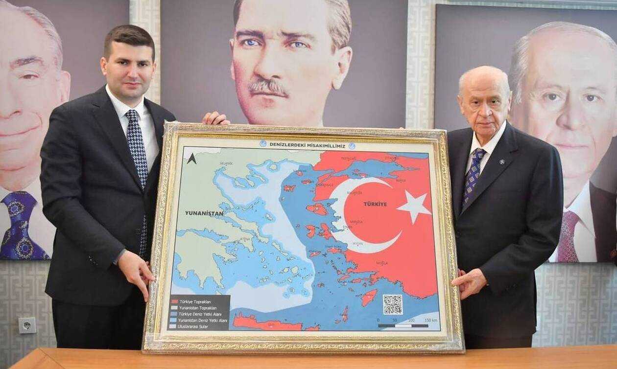 Ο Μάρτενς περιγράφει αναλυτικά τους χάρτες που παρουσίασε ο Ντεβλέτ Μπαχτστελί με ελληνικά νησιά, όπως τη Μυτιλήνη, τη Χίο, την Κρήτη, και καμιά δεκαριά ακόμη, με το κόκκινο χρώμα της τουρκικής σημαίας επισημαίνοντας ότι πρόκειται για «ένα ξεκάθαρο μήνυμα, ειδικά από τη στιγμή που ο Μπαχτσελί είπε μόλις πριν από λίγες εβδομάδες ότι τα νησιά, που κάποτε ήταν μέρος της Οθωμανικής Αυτοκρατορίας, είχαν κλαπεί από την Τουρκία, οπότε πρέπει να της επιστραφούν ”εθελοντικά ή με τη βία”.