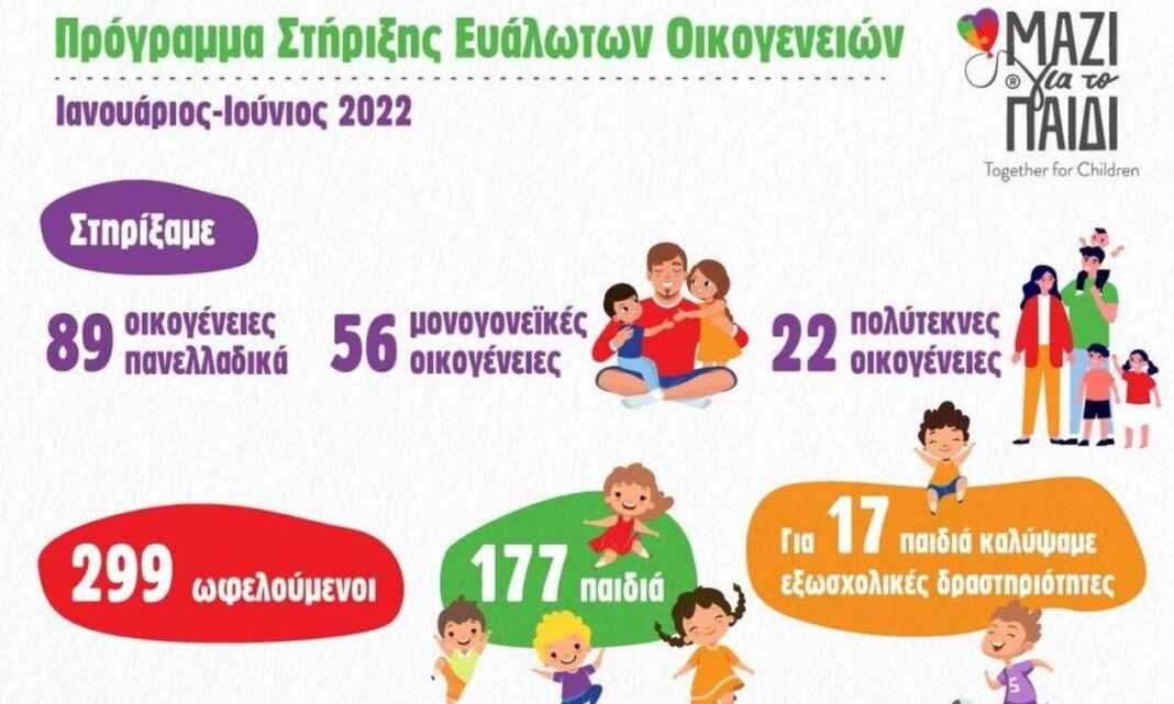 Πιο συγκεκριμένα το «Μαζί για το Παιδί» το α ’ εξάμηνο του 2022 παρείχε στήριξη σε 177 παιδιά από 89 οικογένειες σε όλη την Ελλάδα που βρίσκονταν στο όριο της φτώχειας. Στόχος του «Μαζί για το Παιδί» είναι να βελτιώσει τις συνθήκες ζωής οικογενειών με ανήλικα παιδιά που βρίσκονται σε οικονομική δυσχέρεια και σε κοινωνικό αποκλεισμό.