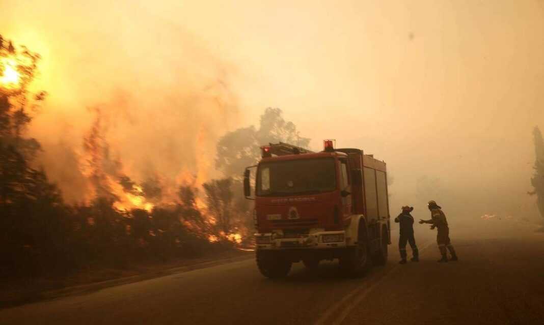 Φωτιά: Στη μάχη με τις φλόγες βρίσκονται και αστυνομικοί που προσπαθούν να βοηθήσουν τους πολίτες.