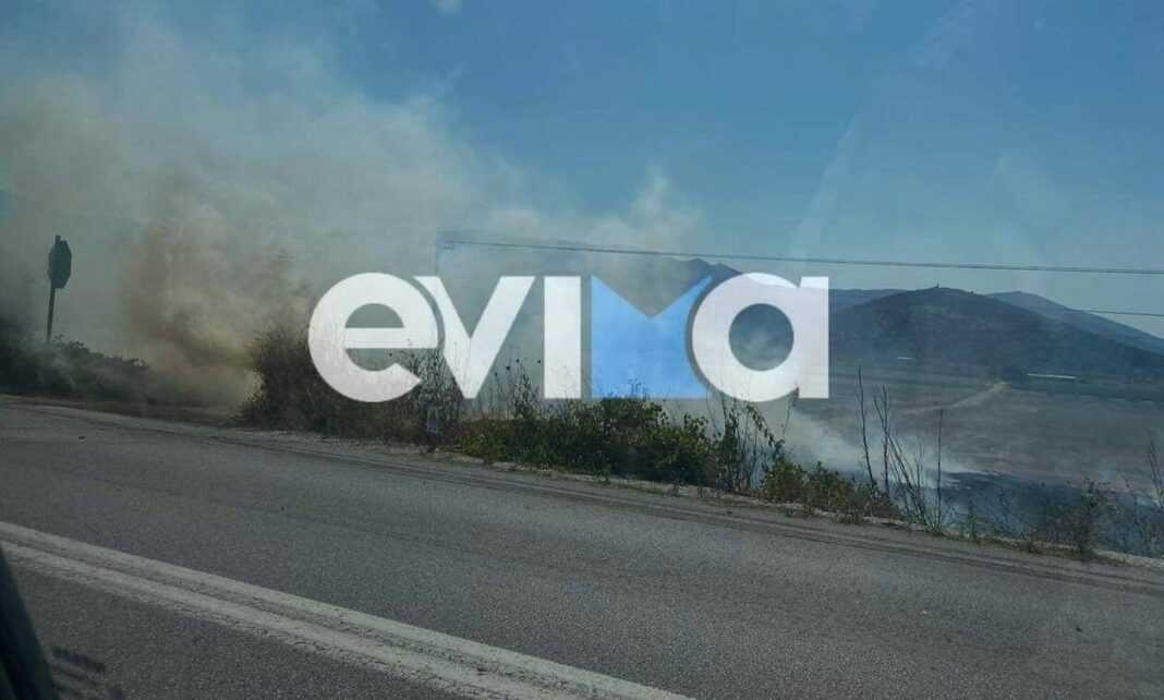 Σύμφωνα με το evima.gr, η πυρκαγιά καίει ξερά χόρτα δίπλα στον δρόμο στον κάμπο του Δύστου.