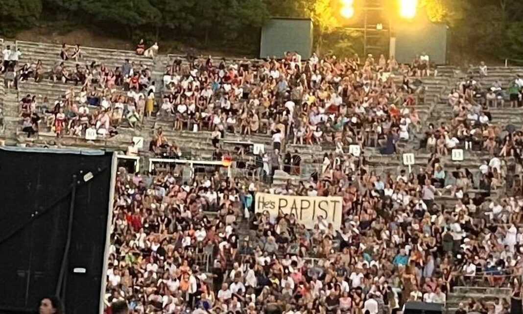 Αυτήν τη φορά, όπως δημοσιεύει το Newsbomb.gr πολίτες που παρακολούθησαν παράσταση στο Αρχαίο Θέατρο της Επιδαύρου σήκωσαν πανό στο οποίο αναγραφόταν στα αγγλικά «He is rapist» (βιαστής είναι).