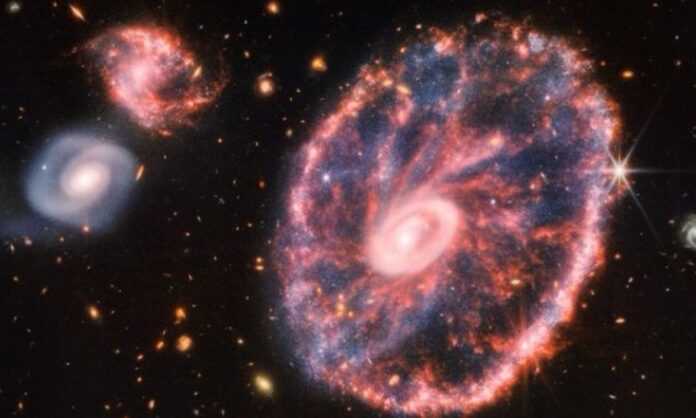 Η NASA δημοσιοποίησε μια σπάνια και εντυπωσιακή εικόνα ενός γαλαξία που απέχει 500 εκατομμύρια έτη φωτός μακριά από τη Γη, του γαλαξία Cartwheel, του οποίου οι δακτύλιοι απαθανατίζονται με πρωτοφανή ευκρίνεια χάρη στο υπερσύγχρονο διαστημικό τηλεσκόπιο James Webb.