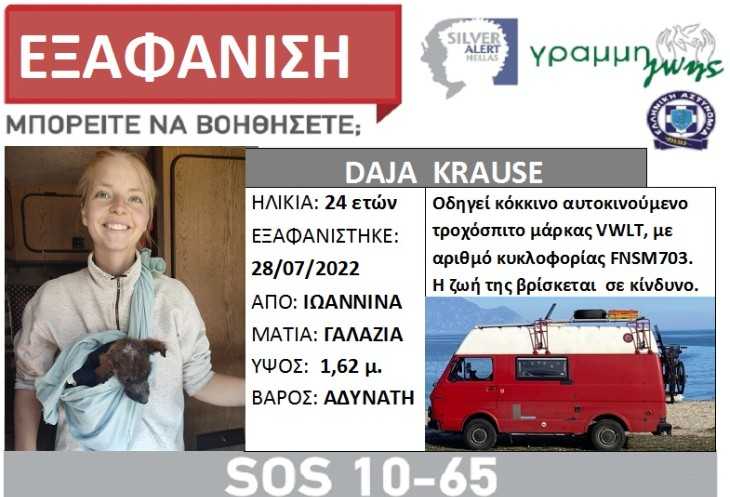 Silver Alert: Την εξαφάνιση 24χρονης Γερμανίδας που είχε έρθει στη χώρα μας για διακοπές γνωστοποιεί με ανακοίνωσή της η Γραμμή Ζωής