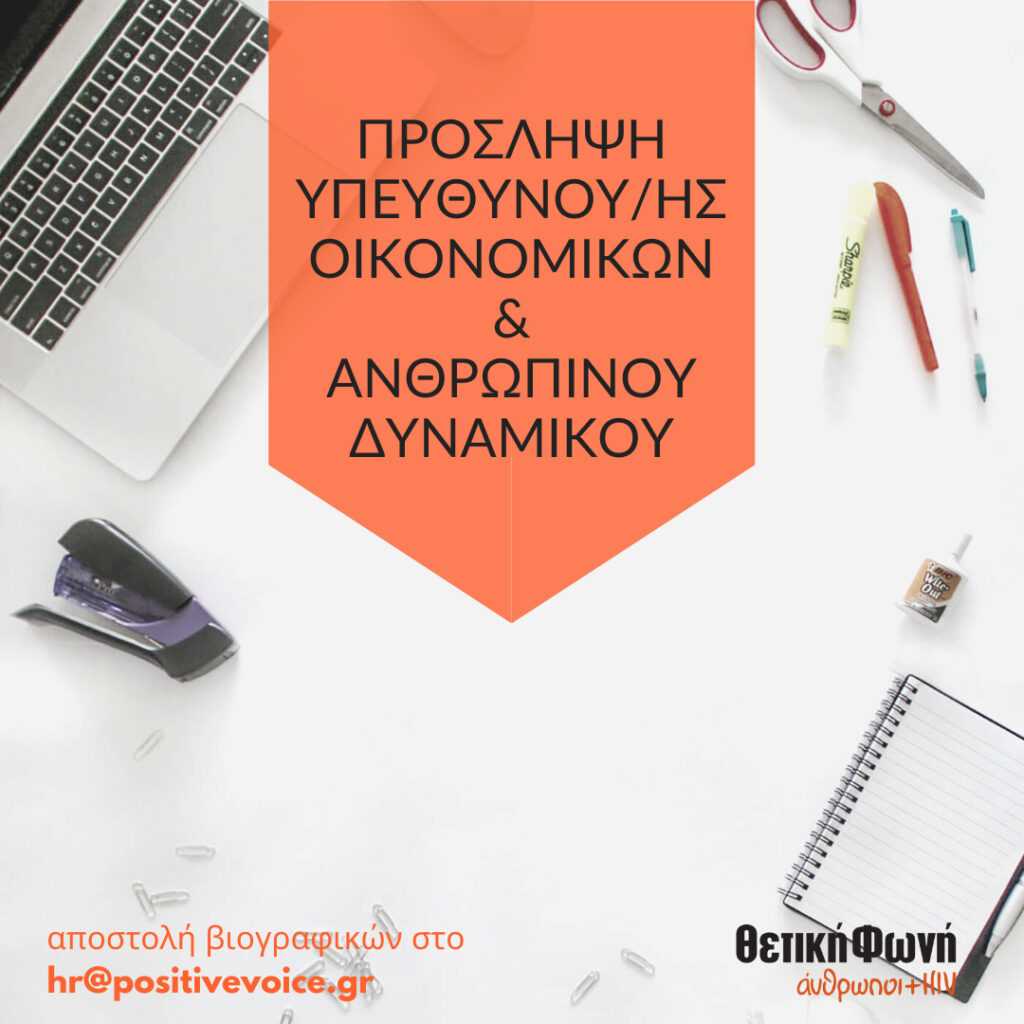 Η Θετική Φωνή – Σύλλογος Οροθετικών Ελλάδος προκηρύσσει την πρόσληψη εργαζόμενου/ης με σχέση εξαρτημένης εργασίας ιδιωτικού δικαίου, πλήρους απασχόλησης, ορισμένου χρόνου, ως Υπεύθυνου Οικονομικών και Ανθρώπινου Δυναμικού.