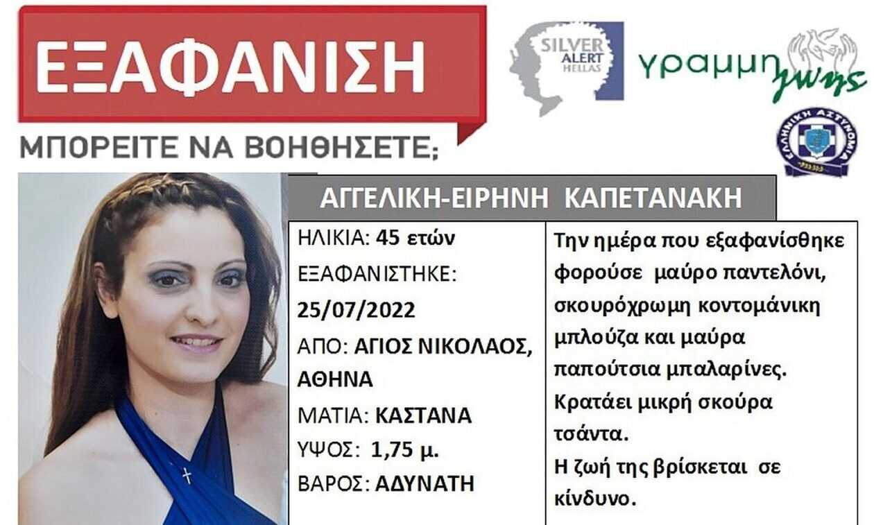 Βρέθηκε η 45χρονη Αγγελική – Ειρήνη Καπετανάκη, η οποία αναζητούταν από τις 25 Ιουλίου στην περιοχή Αγίου Νικολάου στα Κάτω Πατήσια. Την ημέρα που εξαφανίστηκε η γυναίκα πήγαινε στη δουλειά της, όμως σήμερα Παρασκευή 5 Αυγούστου βρέθηκε στην Σαρωνίδα, 11 μέρες μετά την εξαφάνισή της και ύστερα από δημόσια έκδοση του Silver Alert.