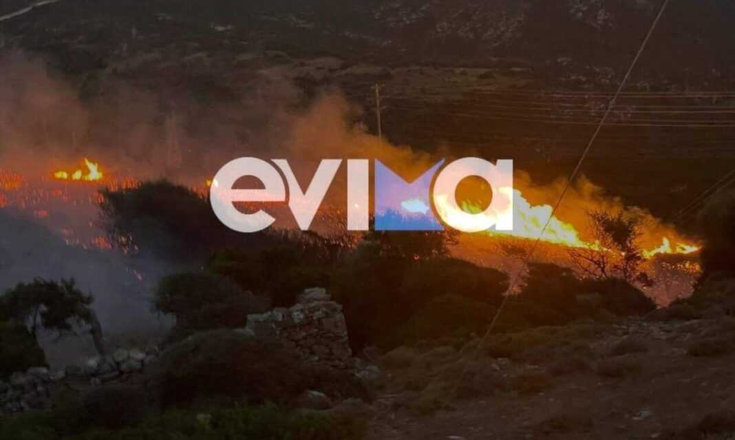 Σύμφωνα με το evima.gr στην περιοχή πνέουν δυνατοί άνεμοι, δυσκολεύοντας το έργο των δυνάμεων της πυροσβεστικής.