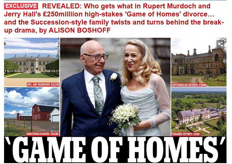 Η αυτοκρατορία μέσων ενημέρωσης του Ρούπερτ Μέρντοχ περιλαμβάνει μεγάλα brands της παγκόσμιας ενημέρωσης, όπως το Fox News και οι εφημερίδες Wall Street Journal, Times και Sun, ενώ η περιουσία του αγγίζει τα 14 δις λίρες. Άγνωστο παραμένει αν είχαν υπογράψει προγμαιαίο συμβόλαιο, την περίοδο του γάμου τους πάντως το 2016, ο δισεκατομμυριούχος έλεγε πως αισθάνεται «ο πιο τυχερός και ο πιο ευτυχισμένος άνθρωπος στον κόσμο».